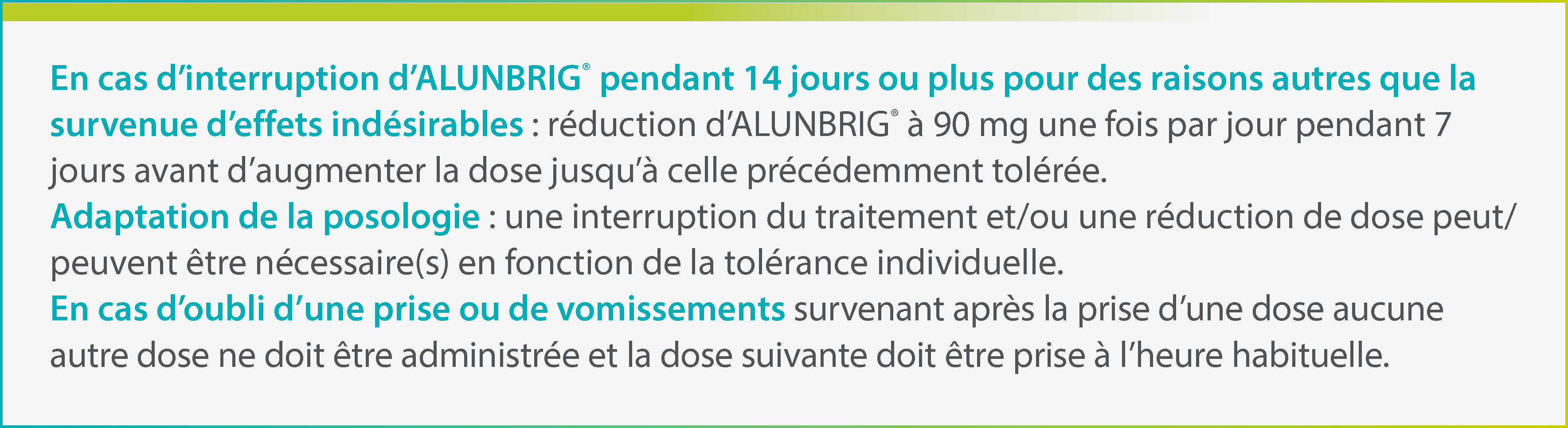 ALUNBRIG® contient du lactose monohydraté. Les patients présentant une intolérance au galactose, un déficit total en lactase ou un syndrome de malabsorption du glucose et du galactose (maladies héréditaires rares) ne doivent pas prendre ALUNBRIG®.